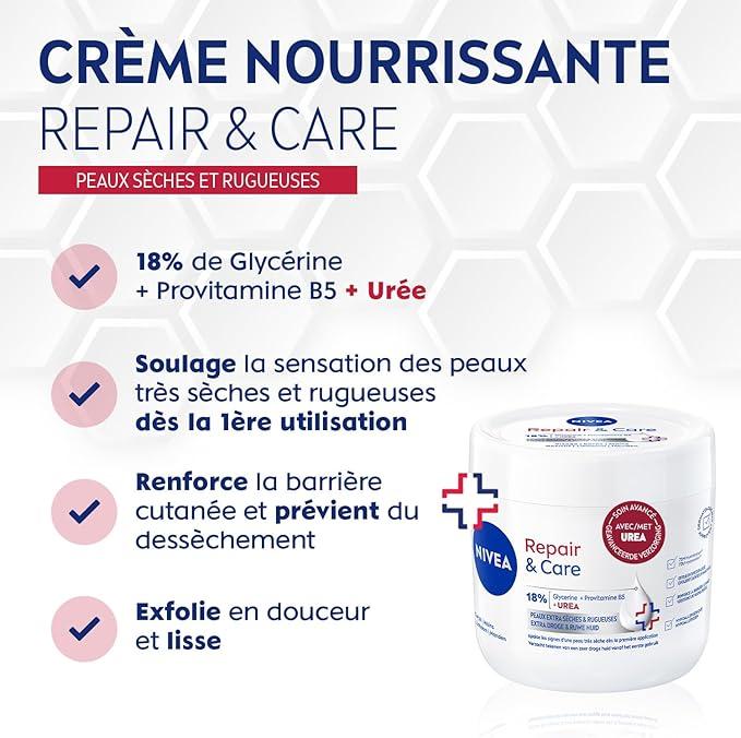 APAISE ET HYDRATE INTENSEMENT : La Crème NIVEA Repair & Care hydrate intensément pendant 72H* et apaise les signes d’une peau très sèche dès la première application. Elle convient aux peaux extra-sèches, rugueuses et aux enfants dès 3 ans.