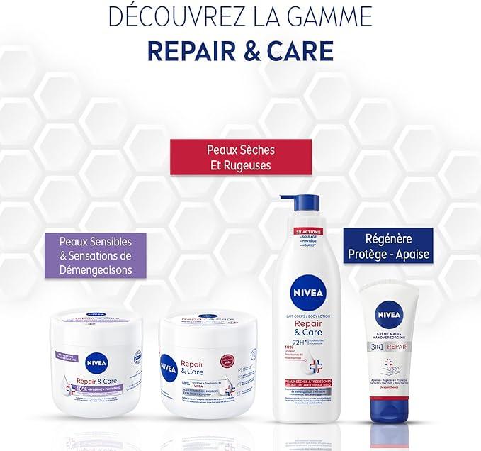 APAISE ET HYDRATE INTENSEMENT : La Crème NIVEA Repair & Care hydrate intensément pendant 72H* et apaise les signes d’une peau très sèche dès la première application. Elle convient aux peaux extra-sèches, rugueuses et aux enfants dès 3 ans.
